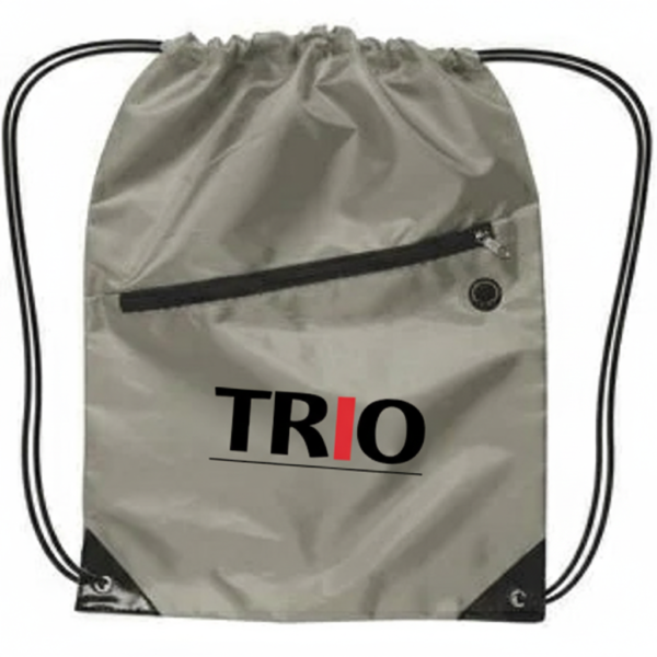 Drawstring Backpack is constructed of nylon with a black adjustable drawstring closure, front zippered compartment, ear bud port, and black reinforced triangle corners with metal grommets. 1-color imprint will be screen printed, 2-color imprinted will be heat transferred. 17″ H x 13″ W